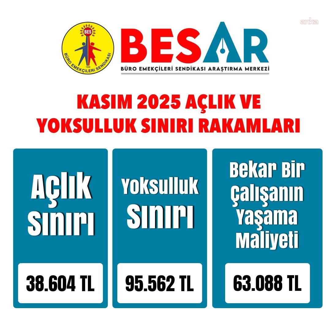 Büro Emekçileri Sendikası Araştırma Merkezi (BES-AR), Kasım 2025’e ilişkin açlık ve yoksulluk sınırı verilerini yayımladı. Araştırma, dört kişilik bir memur ailesinin sağlıklı şekilde beslenebilmesi için gereken aylık gıda harcamasının 38 bin 604 liraya yükseldiğini ortaya koydu.