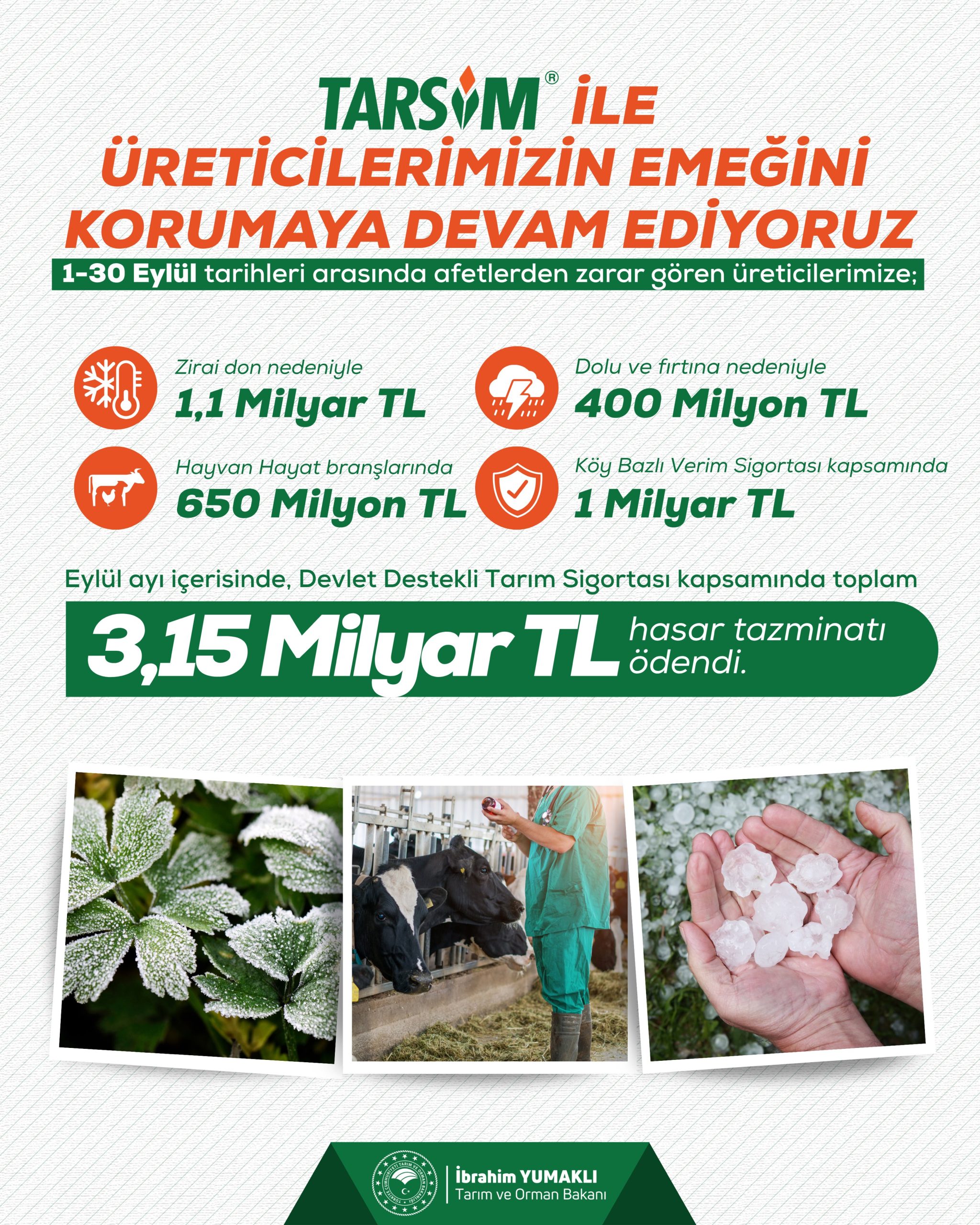 Yumaklı’nın paylaşımında yer alan bilgilere göre, eylülde zirai don için 1,1 milyar lira, dolu ve fırtına için 400 milyon lira, hayvan hayat branşlarında 650 milyon lira ve köy bazlı verim sigortası kapsamında da 1 milyar lira ödeme yapıldı.